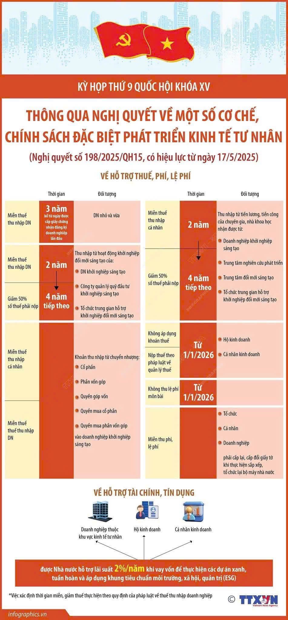 Ngày 19/05/2025, Quốc hội đã ban hành Nghị quyết số 198/2025/QH15 về một số cơ chế, chính sách đặc biệt phát triển kinh tế tư nhân. Nghị quyết là các quy định cụ thể hóa đường lối chủ trương của Nghị quyết 68/NQ-TW đã được Bộ Chính trị ban hành ngày 04/05/2025.